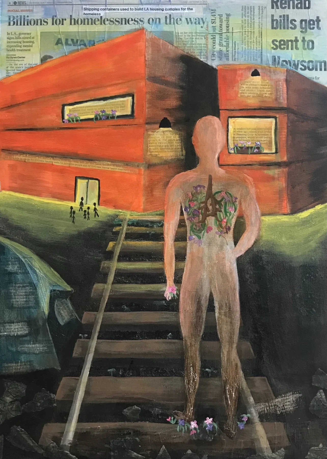 Lack of affordable housing is the leading cause of homelessness. Providing safe shelter and a sense of ‘normal’ is vital. Repurposed shipping containers are converted quickly and affordably into long lasting, comfortable homes. In my painting, a person is portrayed departing a homeless, dark past toward a promising, sheltered future. Dead flowers, an abandoned tent and abused money lay behind the person as they walk toward their future; an inviting home. Focusing on the hands and feet, flowers symbolize hope and change. Bright orange container homes reflect a secure life ahead. Affordable housing is the future and will change the World.